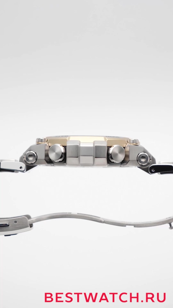 Casio MTG-B3000D-1A9 сочетает классический серебристый тон металла с выразительными деталями, которые подчёркивают премиальный характер модели. Сложная 3D-форма корпуса и безеля, а также высококачественная полировка стали создают впечатление глубины и текстуры, что особенно заметно в свете и на солнце.