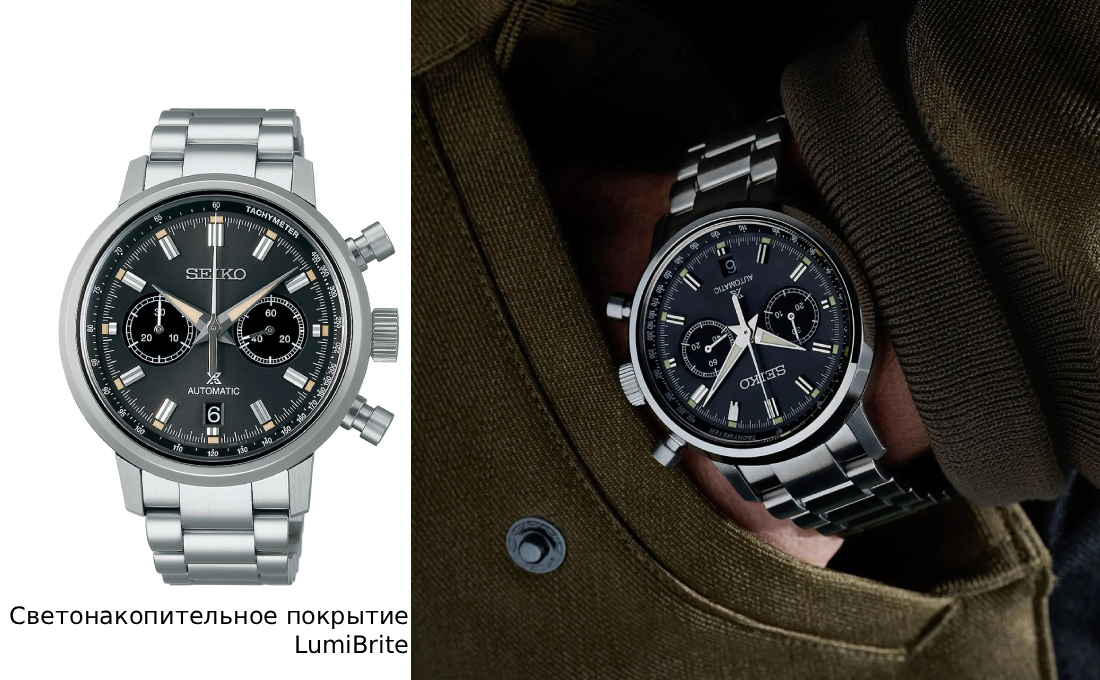 Корпус диаметром 42,5 миллиметра выполнен из нержавеющей стали со сверхтвердым покрытием, которое повышает его устойчивость к царапинам и износу. Циферблат цвета древесного угля или темно-серого с солнечным узором имеет компоновку "бикомпакс" (два счетчика) и внутренний фиксированный фланец с тахиметрической шкалой, что обеспечивает отличную читаемость.